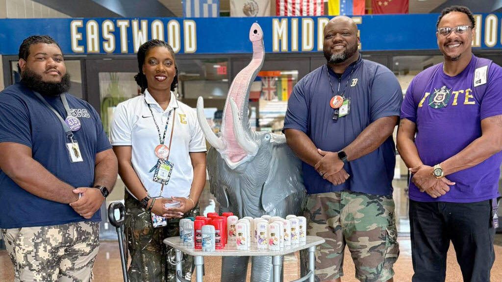 The Alpha Tau Chapter of Omega Psi Phi Fraternity, Inc. partnered with Eastwood Middle School to provide essential hygiene products for students, continuing the chapter’s